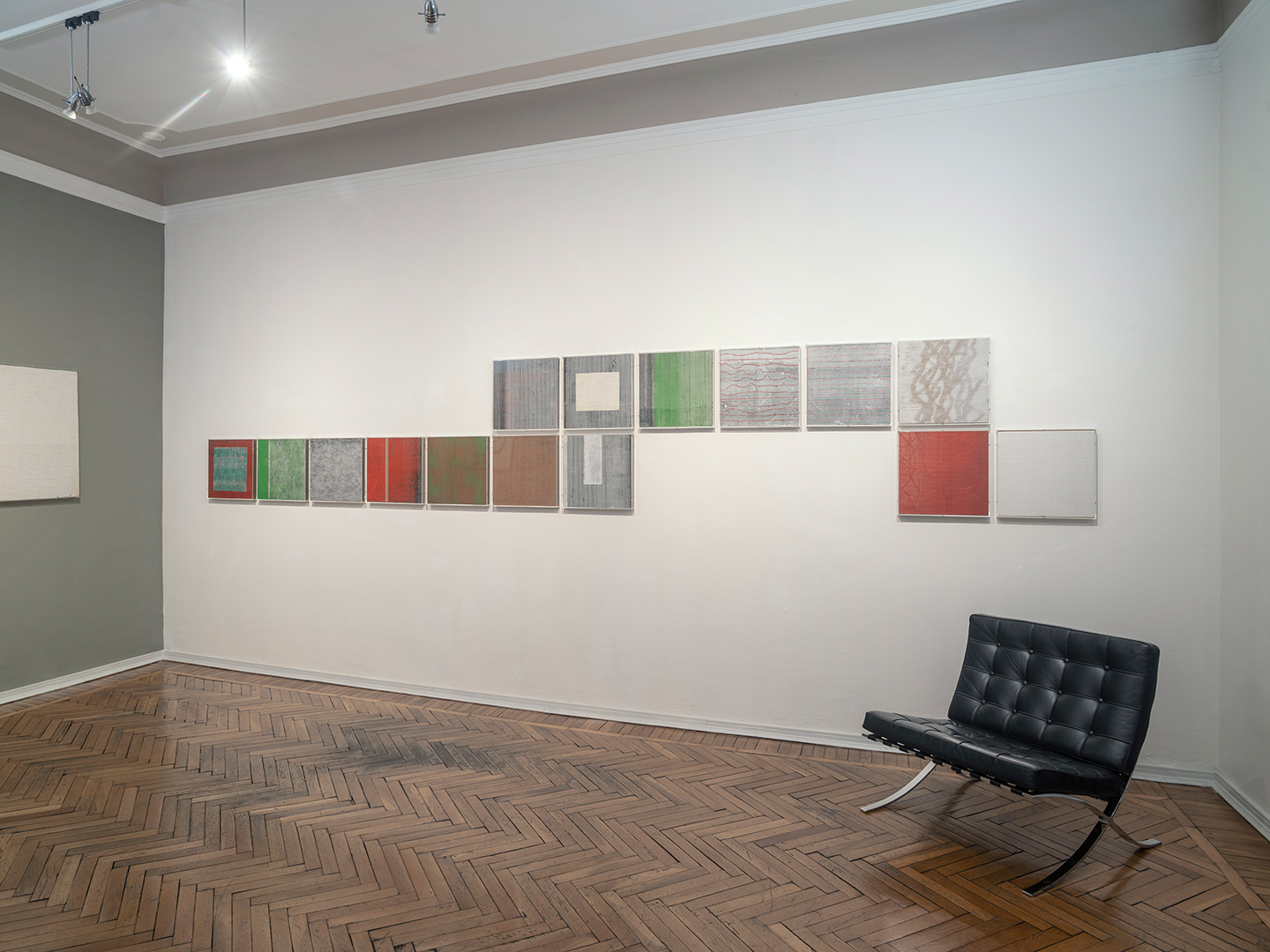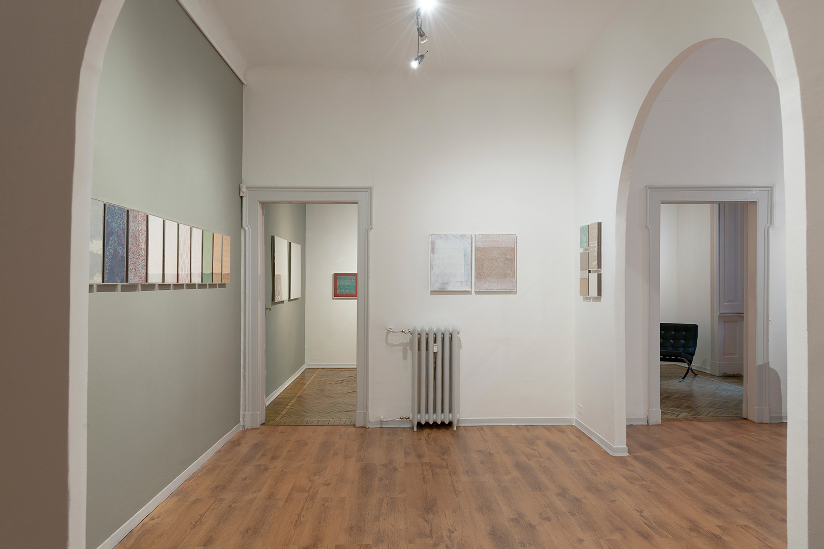 As the other members of the Pittura Analitica movement, Masi’s attitude as a painter turns to the prime components of painting practice, such as stroke, light and colour reduced to the lowest common multiple of elements of minimal lexis, primary vocabulary of the act of painting. From this alphabet, Masi creates a space which, by filling up with stratified and overlapping elements, triggers the constant reflection on the infinite possibility of artistic action which, in a combinatorial game never pleased with itself, questions the space of perception.