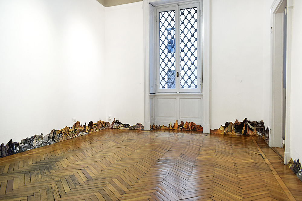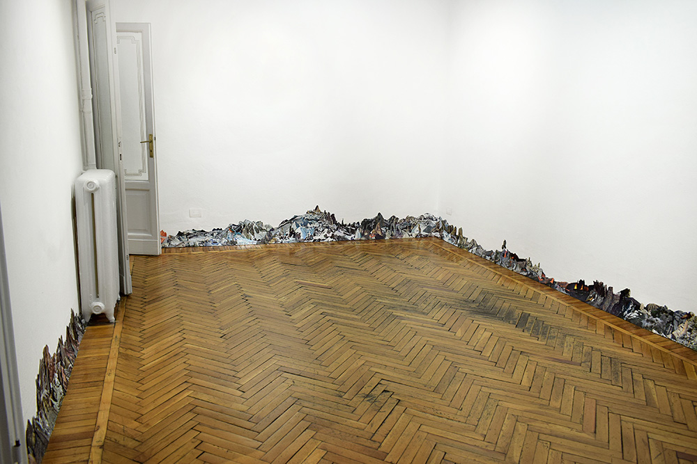 The title of the exhibition, Rêver (from French: to dream, desire, imagine, fantasize, think, but also reverse, reverse side, flip side, reinterpretation in other languages), introduces the main work, a site-specific installation that turns the gallery space into a vast visual panorama. The piece unfolds as a circular composition of cut-outs from photographic books, arranged along the walls of the main hall. Positioned at the centre, the visitor is enveloped by the artwork and can explore its every detail. This approach conjures the ancient panorama technique, a circular artwork designed so that the viewer, standing in the middle, can easily contemplate each element. The exhibition’s title, Rêver, is no arbitrary: it is a palindrome, readable in both directions, suggesting the circularity of space, gaz