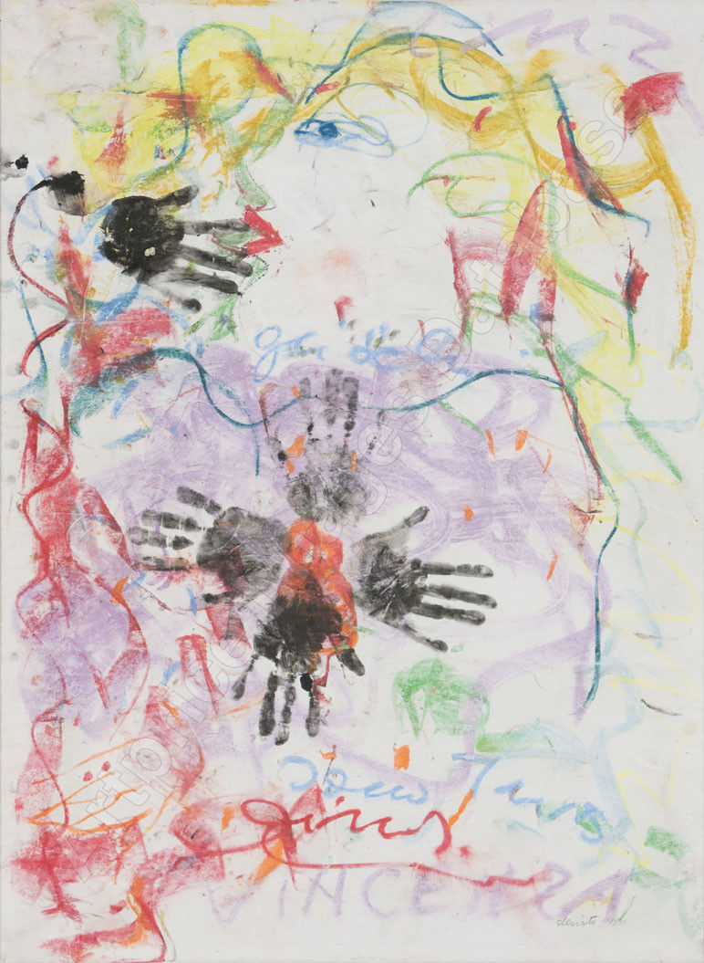 He is an artist whose practice was remarkable for a transgressive performative activity, closely bound up with social issues related to the Neapolitan anthropological territory. In 1960, while being a teacher at the Art Institute in L’Aquila, he created the series of Carte Stracce/Torn Papers and Monumenti Effimeri/Ephemeral Monuments, improvised assemblages of everyday objects (cardboard, tin or plastic containers, pieces of broken dolls or mannequins, flowers and fake fruit of the kind found on market stalls or votive shrines, flashing Christmas lights, clippings of photographs from fashion magazines, veils, and flowers). Moving in 1963 to the School of Art in Sorrento, he started cellophaning the inhabitants, mostly fishermen, in the small village of Marina Grande. At the same time, he began to investigate writing, placing it on living bodies or inanimate images. During the same years, together with a variety of actions (in streets, studios, and galleries), he continued to produce drawings and sketches, becoming his predominant activity after 1978, with the “reappropriation of painting after Body Art”.
